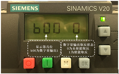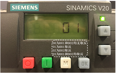 V20变频器的继电器输出的逻辑可以通过P0748参数取反。P0748参数是一个可以进行位设置的参数,首先进入该参数后显示当前数字量输出取反状态,01的含义是DO1数字量输出1已取反: