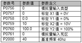 默认情况下10V对应于电机额定频率(通常为50hz),如果需要设置10V对应于40hz,可以通过修改基准频率P2000实现,参数如下: