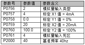 默认情况下20mA对应于电机额定频率(通常为50hz),如果需要设置20mA对应于40hz,可以通过修改基准频率P2000实现,参数如下: