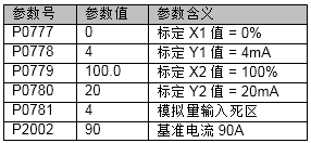 默认情况下20mA对应于电机额定电流的2倍,如果需要设置20mA对应于90A,可以通过修改基准电流P2002实现,参数如下: