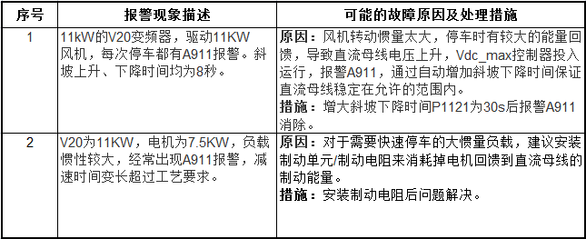 2. 大惯量负载快速停车,P1121斜坡下降时间设置过短。
