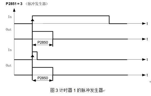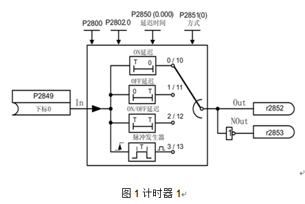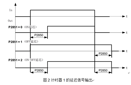 V20系列变频器中有4个计时器(Timer),可以实现位信号的ON延迟(上升沿延迟)、OFF延迟(下降沿延迟)、ON/OFF延迟和脉冲发生(脉冲宽度调整)。
