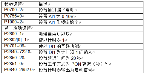 V20变频器通过DI1延迟20秒启动,停机不延迟,模拟量通道1作频率给定(0-10V),参数设置如下: