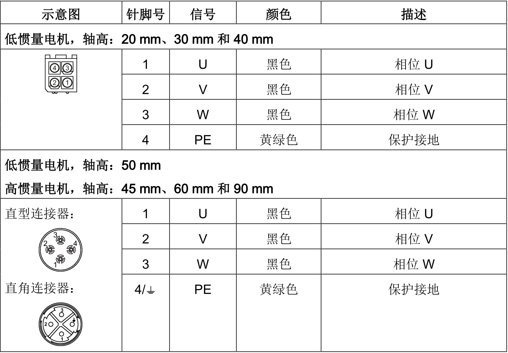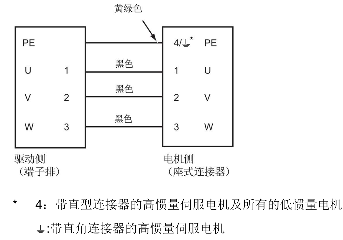 接线(低惯量电机,轴高:50 mm及 高惯量电机,轴高:45 mm、65 mm 和 90 mm):