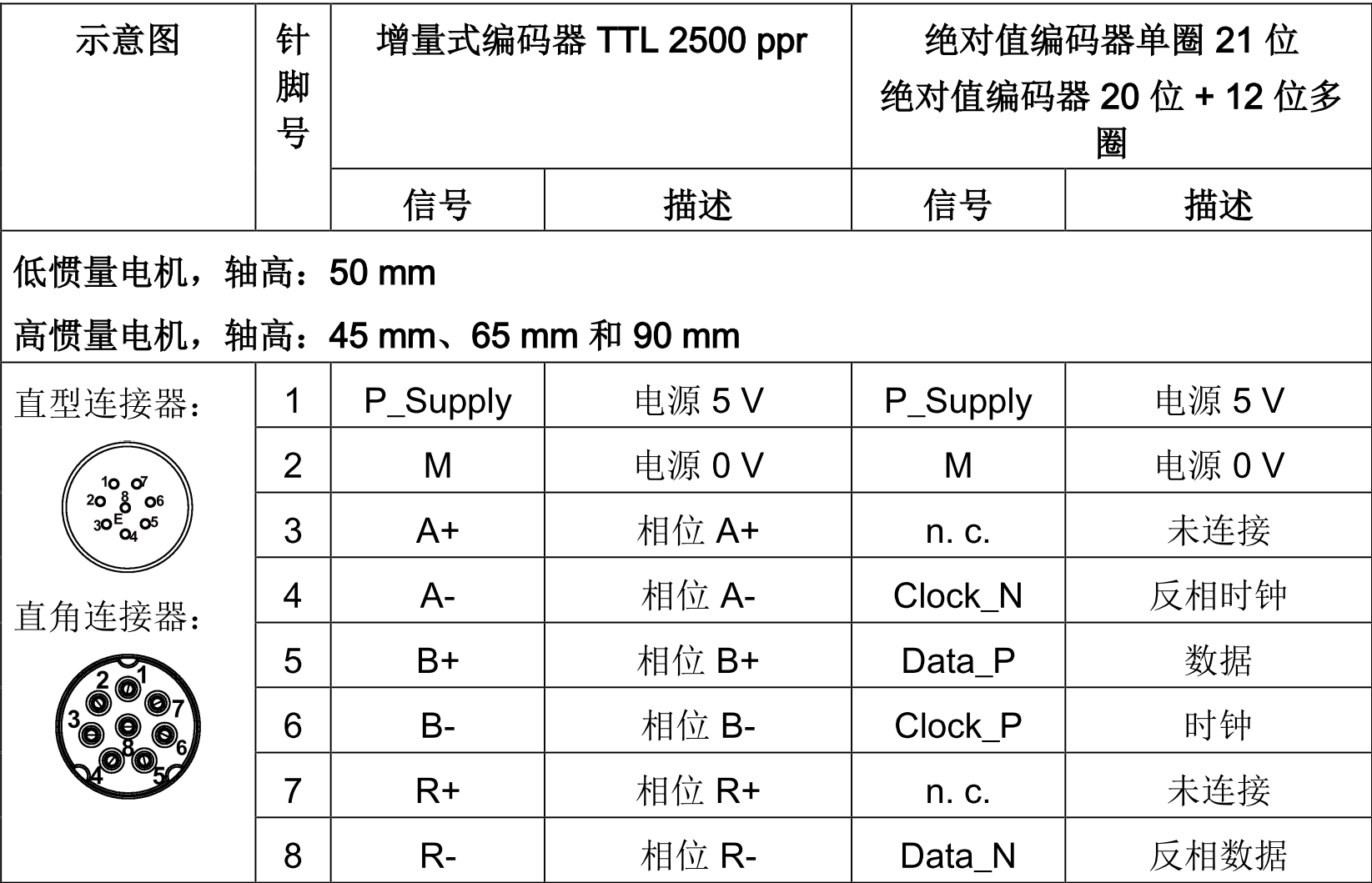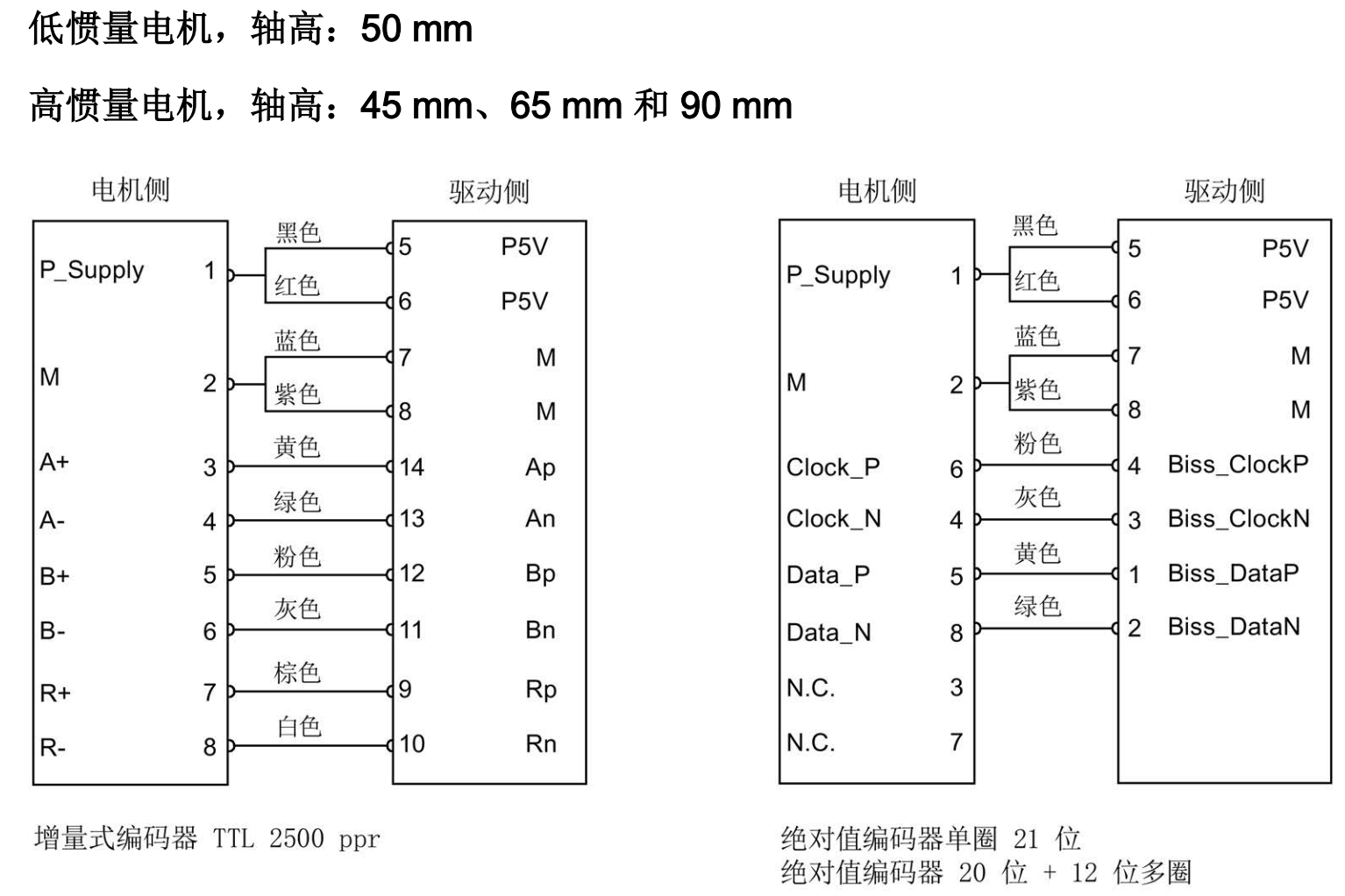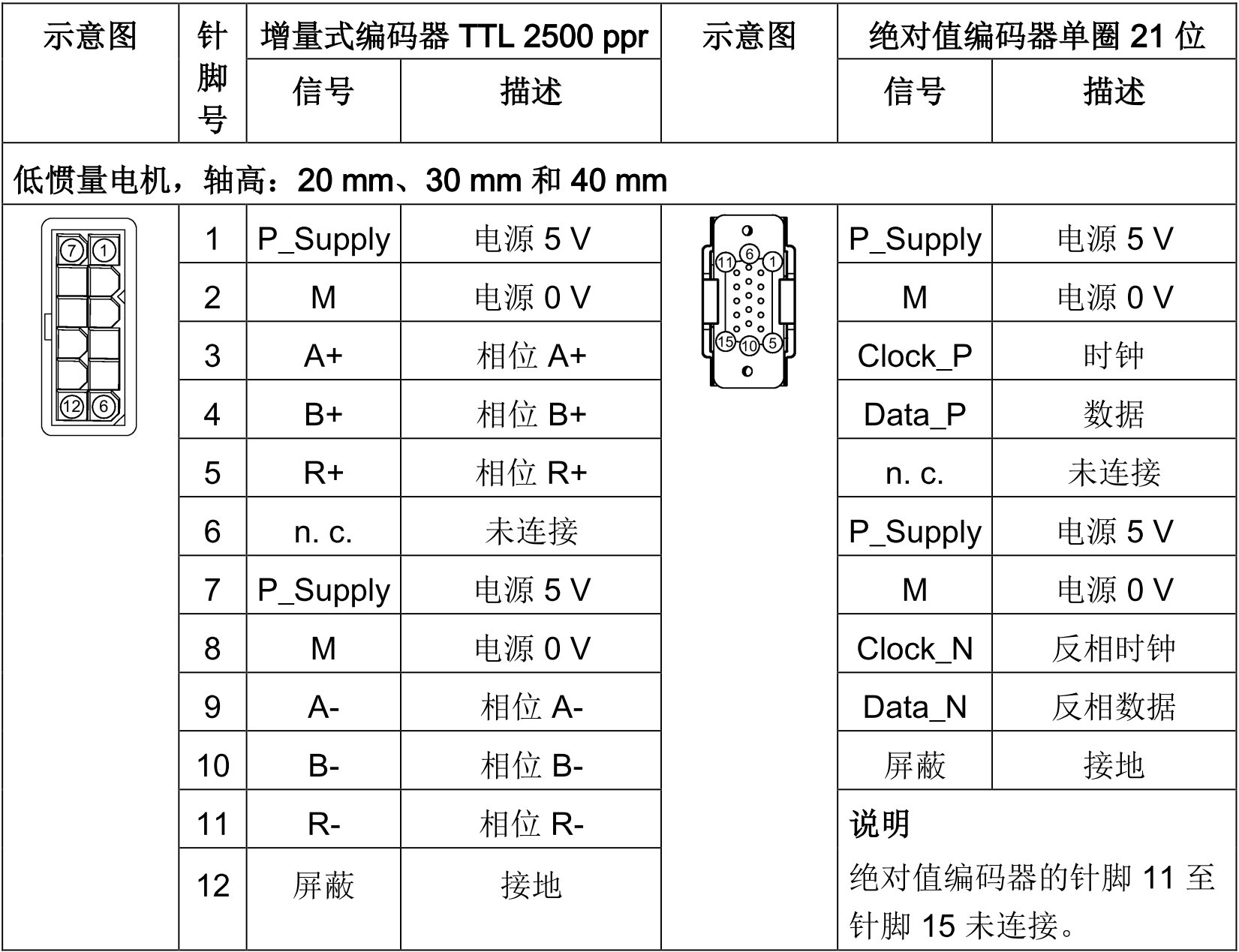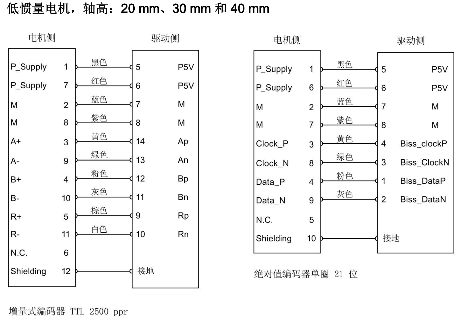 接线(低惯量电机,轴高:20 mm、30 mm 和 40 mm):