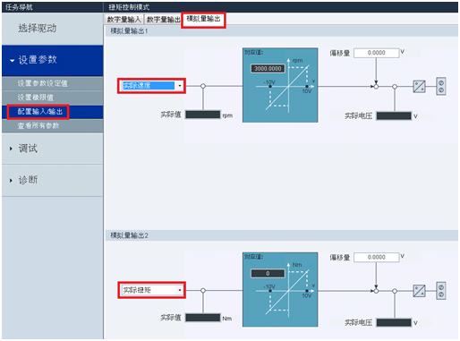 V90在转矩控制模式(T)下模拟量1(AI1)用于速度限制值给定,在调试软件V-ASSISTANT中进行设置,如图2-4所示;模拟量2(AI2)可以设置为转矩给定值,如图2-5所示。