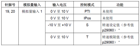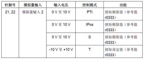 SINAMICS V90 支持两个模拟量输入。其输入电压在不同的控制模式下会有所不同,如表2-1所示。
