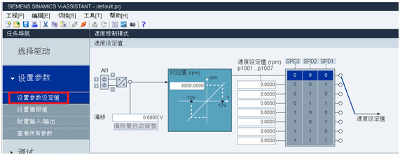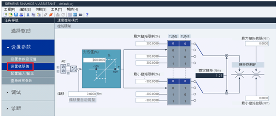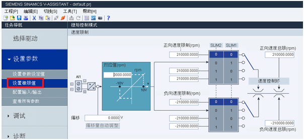V90在速度控制模式(S)下模拟量1(AI1)用于速度给定,在调试软件V-ASSISTANT中进行设置,如图2-2所示;模拟量2(AI2)可以设置为转矩极限如图2-3所示。