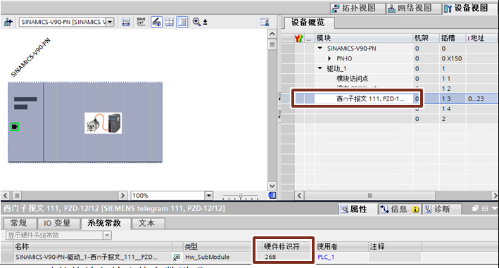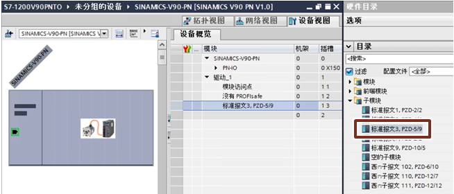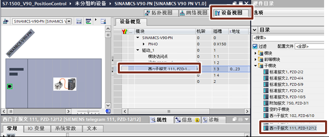 2. 在V90 PN的设备视图中插入西门子报文111
