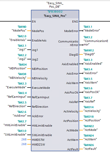 4.在OB1中调用Easy_SINA_Pos功能块,为功能块各参数添加变量: