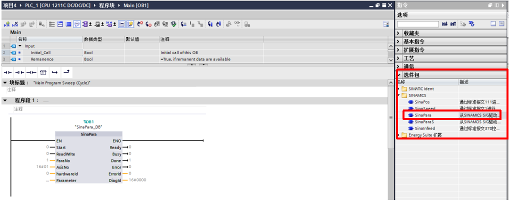 (1)创建博途项目,打开OB1,在指令中选择“选件包”,再选SINAMICS中的“SinaPara”,将其拖到网络中,并填写相关参数。