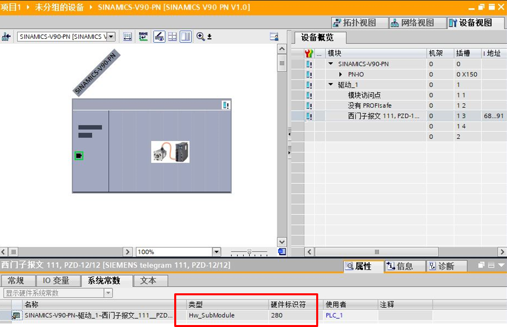 在驱动器的组态中,选择需要读取的驱动对象的报文,在属性中找到Hardware。