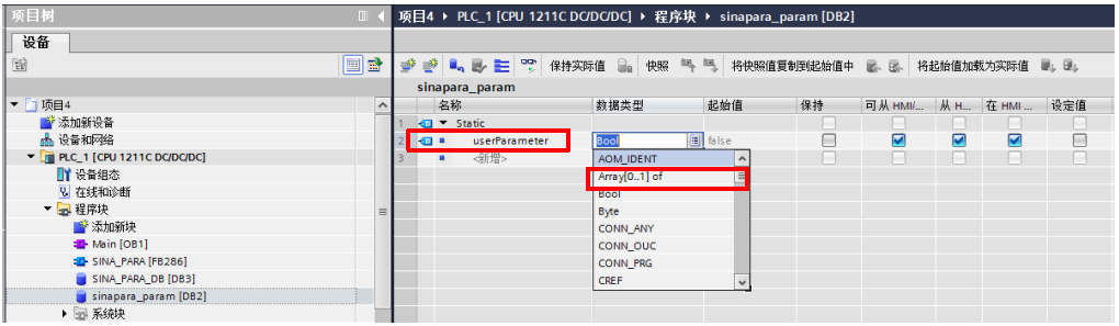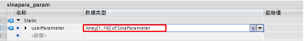 先将选件包中的sinapara指令添加到程序 ,再添加一个新的全局DB块,命名为sinapara_param(可以随意命名) ,打开新建的背景数据编辑器,