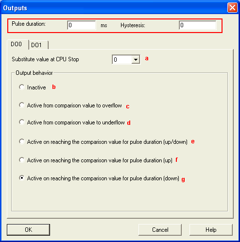| g | 减计数达到比较值时,有输出一段时间,此时间长度在pulse duration中设定 |