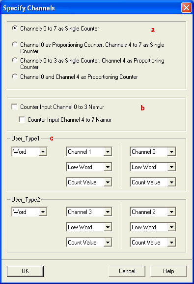 a: 用户可以将0~3号通道或4~7号通道合并为一个Proportioning Counter(比例计数器),在这种模式下,比例计数器使用第一个计数通道的输入端子,在‘0’和设定值之间计数一次。