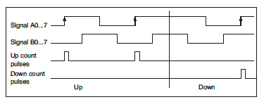 d: 四倍速旋转编码器,输入信号为A/B相正交信号,A信号超前B信号90度时增计数,B信号超前A信号90度时减计数,仅在A/B信号上升沿和下降沿到来时计数值加(减)1。如图所示: