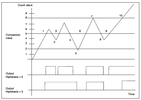 用户可以设定一个滞后参数,范围从0-255,表示计数值的变化。下图展示了滞后功能的效果: