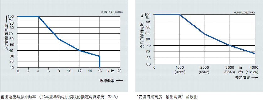 各种模块的降容曲线请参考S120选型手册PM21_2013_Complete_chs中的降容特性曲线。图1-2是132 A书本型单轴电机模块的降容曲线图: