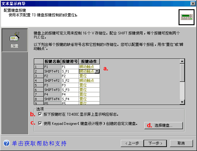 只有选择了 c. 选项,才是使用了 TD 400C 的“自定义按键”功能。所谓自定义按键,就是改变缺省按键布局的按键功能分配,或者改变缺省情况下的按键名称,或按键符号。对于用户程序来说,缺省情况下的 F1 - F8、Shift+F1 - Shifit+F8 本来就可以由用户分配其在用户程序中的功能,可以说这也是“自定义”。这和没有自定义键盘功能的 TD 200 是一样的。如果项目中不需要改变功能键定义或符号等,自然不必自定义键盘。