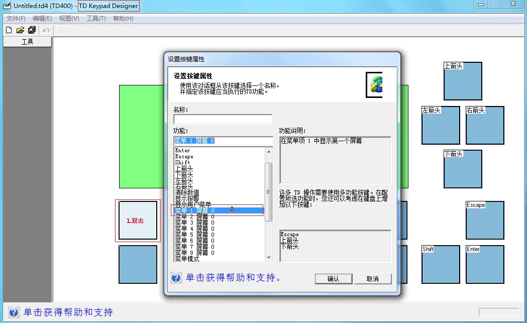 A.TD Keypad Designer(与STEP7-Micro/WIN软件一起安装的,使用该软件需要先在向导里勾选使用TD Keypad Designer创建自定义键盘) 通过该软件设置TD的功能键 ,将功能选为显示对应菜单的屏幕,但是选项里只能选择菜单的屏幕0,TD400C有8个菜单,也就只能打开8个