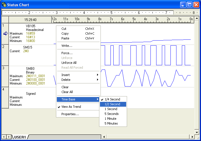 在趋势图中点击鼠标右键,在快捷菜单中可以设置图形更新的时基(速率)。在这里选择的速率仅是Micro/WIN图形刷新的速率,与实际的变量变化无关。