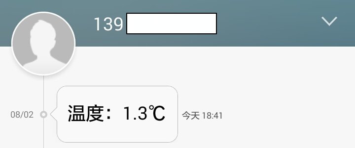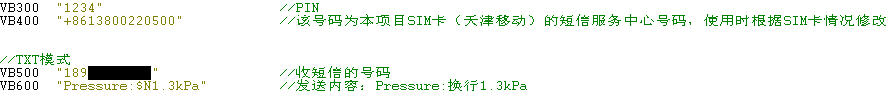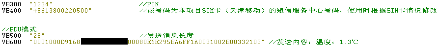 例子:发送“温度:1.3℃”到指定手机号码“18912345678”,需要编辑SMS_send_msg为: