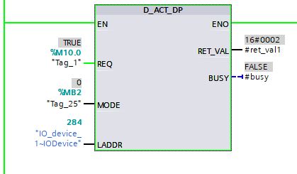 当D_ACT_DP指令的输入参数MODE的值为0时,可以通过该指令查询IO从站当前的激活/取消激活的信息。此信息通过参数RET_VAL输出。如图所示: