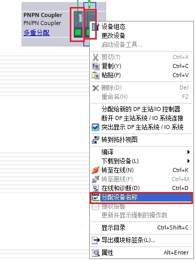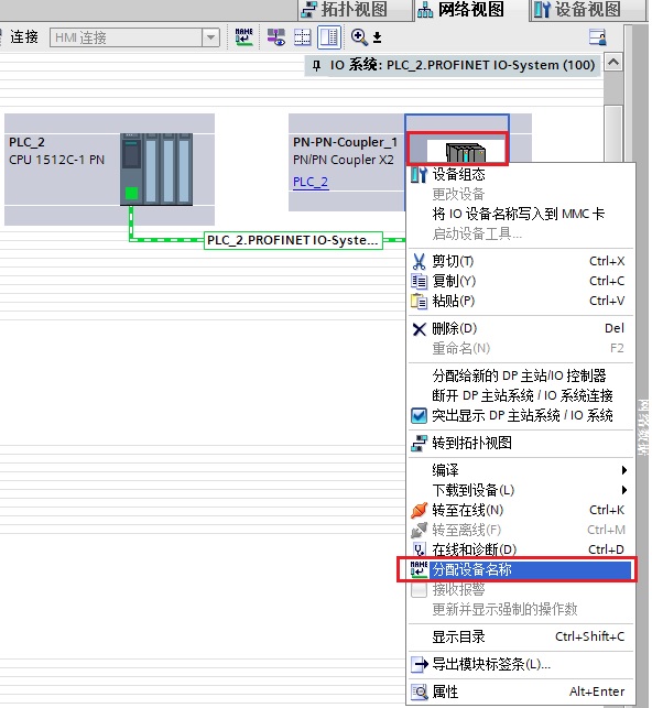 打开网络视图,右键PN/PN Coupler X1图标,在快捷菜单中选择“分配设备名称”;