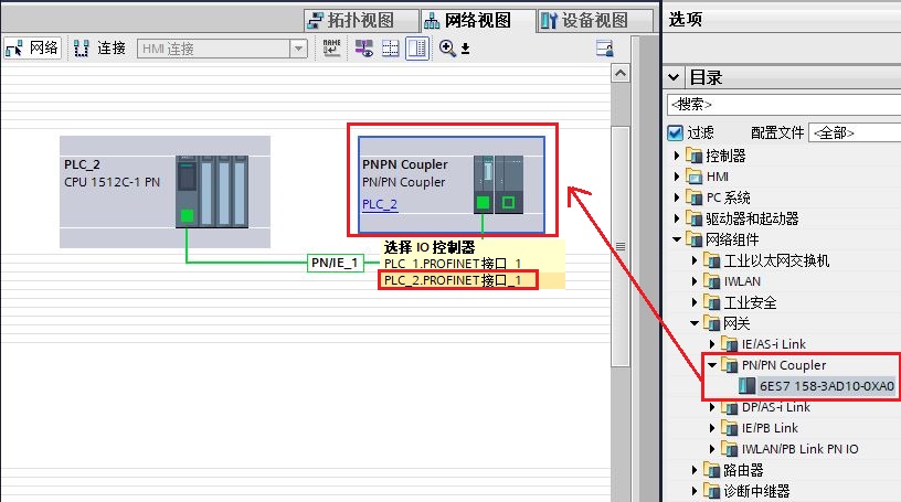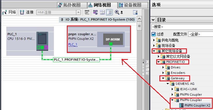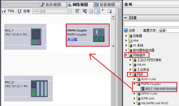 1.打开网络视图,右侧目录中找到“网络组件--网关”,将PN/PN Coupler拖曳至左侧视图,PN/PN耦合器的X1 接口接入CPU1512C-1PN的PROFINET网络;