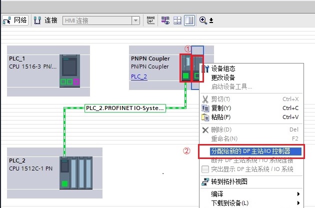 右键PN/PN Coupler左侧X1部分,快捷菜单中选择“分配给新的DP主站/IO控制器”,将PN/PN耦合器X1 连接到CPU1512C-1PN的IO系统中;