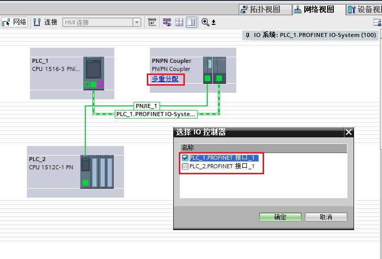 点击IO从站上的“未分配”,选择IO控制器,将PN/PN Coupler X1接入CPU1512C-1PN的IO系统,将PN/PN Coupler X2接入CPU1516-3PN/DP的IO系统;