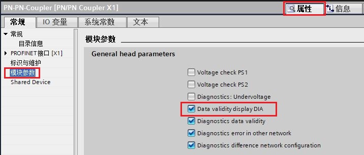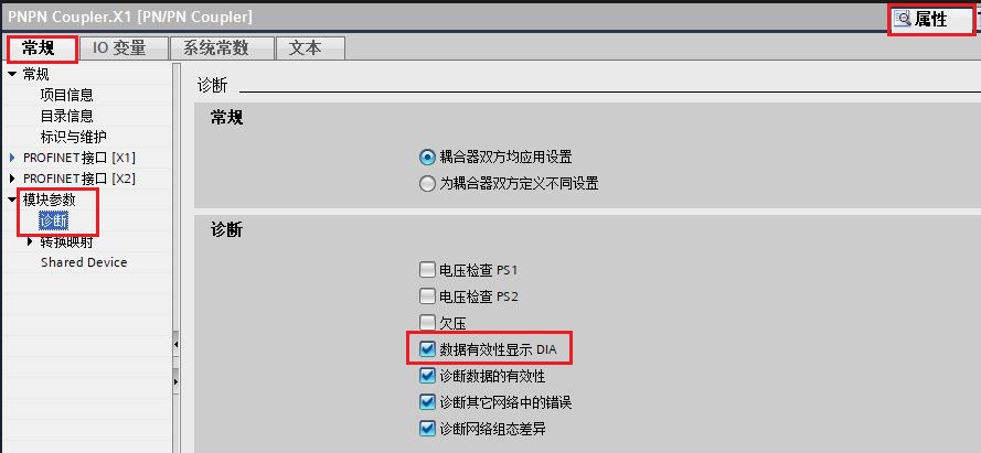 PN/PN耦合器属性中,分别为PN/PN耦合器的X1 和X2 设置数据有效性显示(DIA);