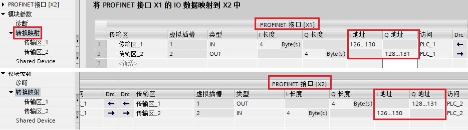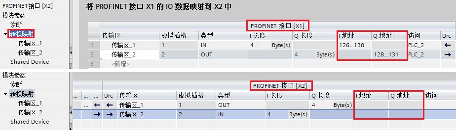 新增传输区,并设置PROFINET[X1]和PROFINET[X2]的IO地址;