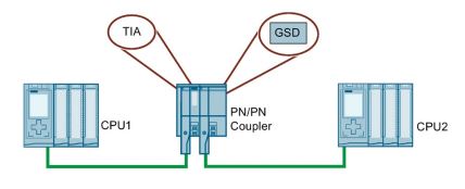 本例对使用博途软件组态PN/PN耦合器,CPU在不同项目中的组态方式进行说明: