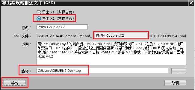 CPU1连接PN/PN耦合器的X1接口,通过组态生成X2的GSD文件。