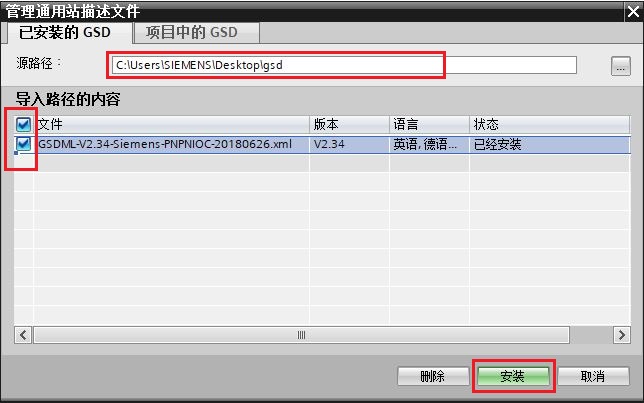 源路径中选择本地下载的GSD文件所在的文件夹,选择需要安装的GSD文件,点击“安装”;