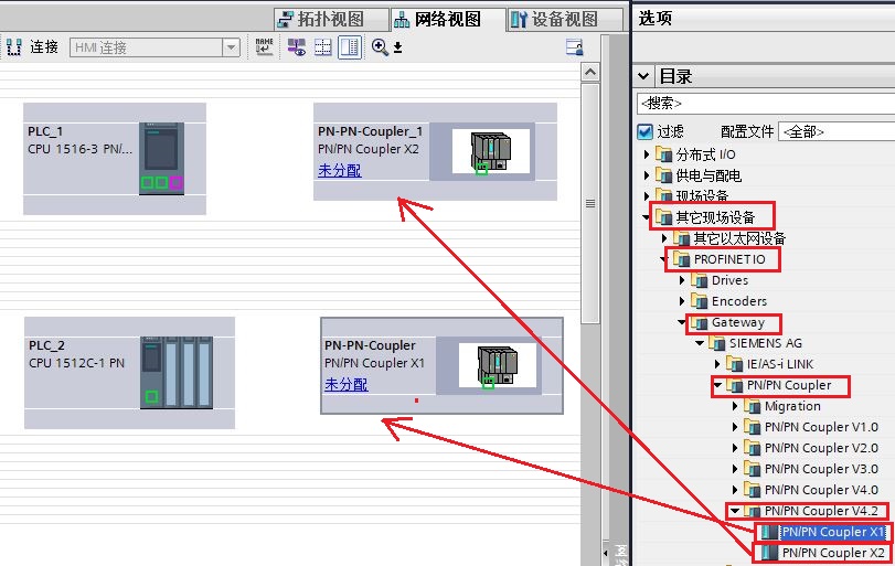 网络视图中,从左侧的硬件目录中找到“其他现场设备--PROFINET IO--Gateway--PN/PN Coupler--PN/PN Coupler V4.2”,分别将 PN/PN Coupler X1和PN/PN Coupler X2拖曳到视图中;