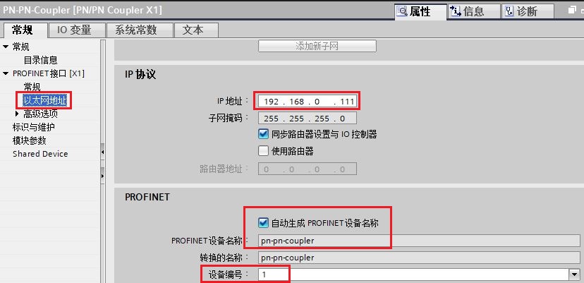 分别设置PN/PN Coupler X1 和PN/PN Coupler X2 的以太网地址,下图以PN/PN Coupler X1 侧设置为例;