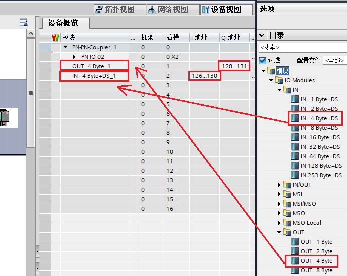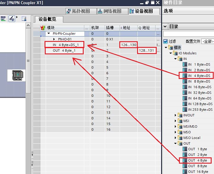 打开设备视图,选择PN/PN Coupler X1,打开左侧硬件目录中的“模块--IO Modules”,将输入输出子模块拖入“设备概览”的插槽中,并分配IO地址;