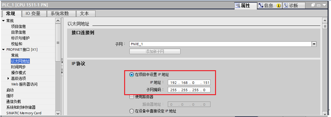 使用TIA Portal创建一个新项目,组态S7-1500站点,并设置IP地址如图1所示。