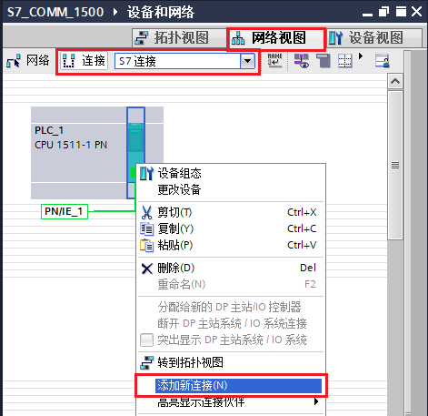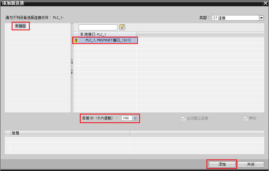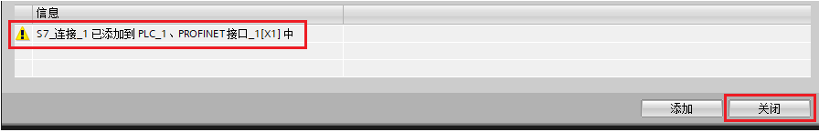 在"设备组态"中 ,选择"网络视图"栏进行网络配置,点中左上角的"连接"图标,连接框中选择"S7连接",然后选中S7-1500 CPU,右键选择"添加新的连接",在创建新连接对话框内,选择连接对象"未指定",选择本地接口"PLC_1,PROFINET接口_1[X1]",点击"添加"按钮,这时在"信息"栏能看到S7连接已添加的信息,点击"关闭"按钮,完成建立新连接,如图 2 所示。