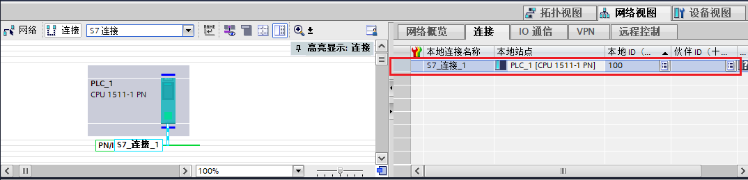 在"网络视图"中间栏的"连接"条目中,可以看到已经建立的"S7_连接_1",如图 3 所示。