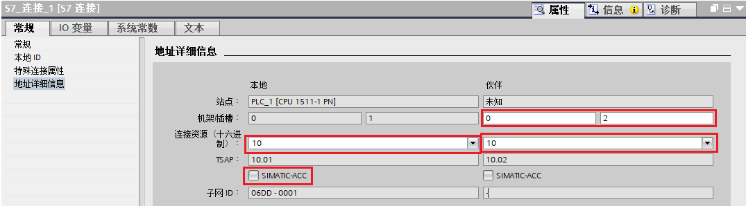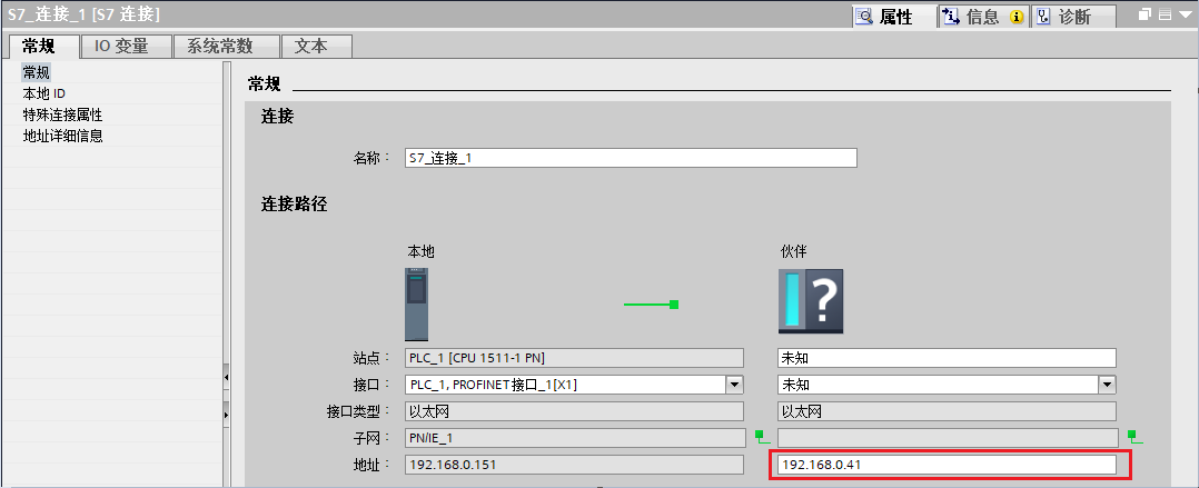 点中上面的连接,在"S7_连接_1"的连接属性中查看和设置各参数。