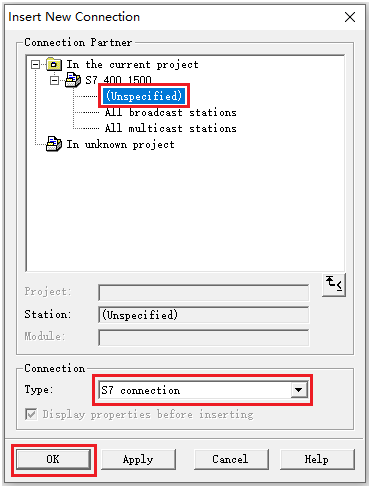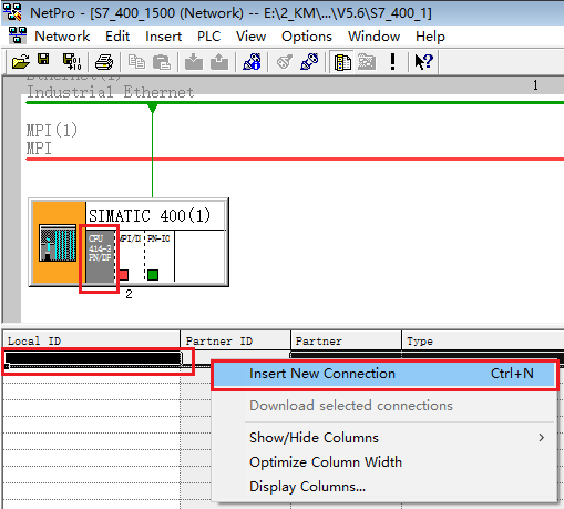在硬件组态界面上方点击"组态网络"图标,进入网络组态的窗口界面,选中S7-400CPU,右键点击下方表格,选择"插入新连接",在弹出的对话框中,连接伙伴选择"未指定",类型选择"S7连接",点击"确定"。如图9所示。