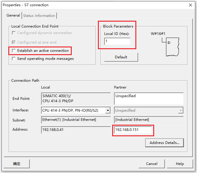 在弹出的S7连接属性对话框中,伙伴的IP地址设置为S7-1500的IP地址(192.168.0.151)。取消勾选"建立主动连接"。设置"Local ID",这里设置为1。