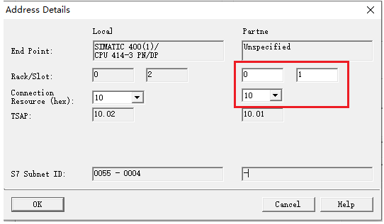 然后点击"Address Detail"按钮,弹出的地址详细信息对话框,设置通讯双方的 TSAP 号,伙伴的机架/插槽设置为S7-1500CPU所在的机架号和插槽号,在这里是0和1。伙伴的连接资源设置为S7-1500站点的本地连接资源,在这里是 10,如图10所示。