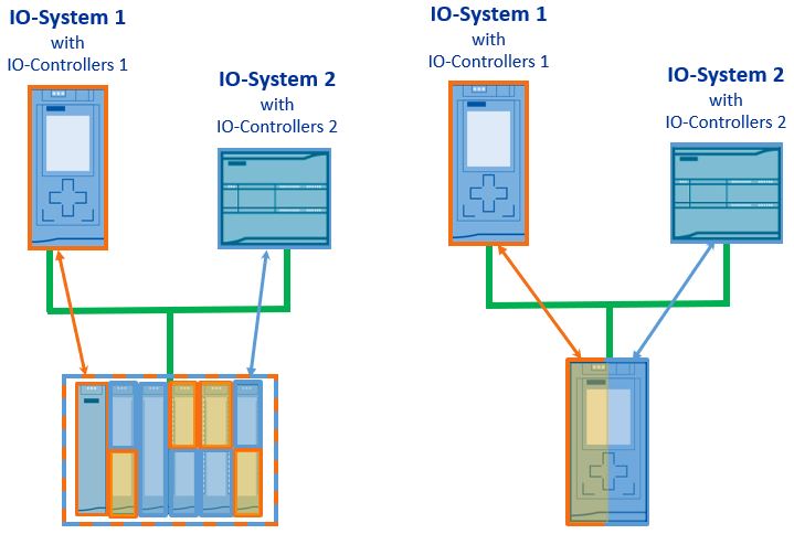 信号模块可以被不同的IO控制器访问的IO设备被称为"共享设备",智能设备也可以作为共享设备。对"共享设备"模块的访问可在不同的IO控制器之间进行分配,"共享设备"的每个子模块以独占方式分配一个IO控制器。这样就可以把现场多个临近的IO模块组合到一个IO设备中,节约了项目成本。下图1是"共享设备"功能的示意图。