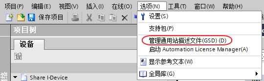 3.1、点击菜单栏“选项”下的“管理通用站描述文件(GSD)”,安装步骤2.3导出的GSD文件,如下图10所示。