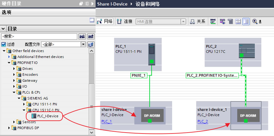 3.2、在硬件目录下查找刚刚安装的GSD文件,“其它现场设备>PROFINET IO>PLCs&CPs>SIEMENS AG>PLC_I-Device",将其拖拽至网络视图并未智能设备分配IO控制器