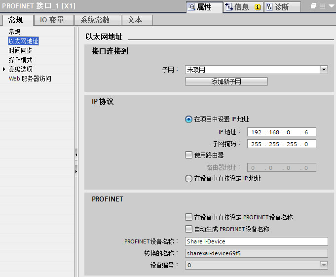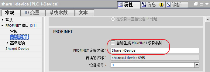 1.5、重复步骤1.2和1.3,添加控制器PLC_I-Device(6ES7 511-1CK00-0AB0 版本V2.8),子网选择未联网及设置IP地址,去掉“自动生成PROFINET设备名称”,手动输入设备名称“Share I-Device”,如下图6所示。